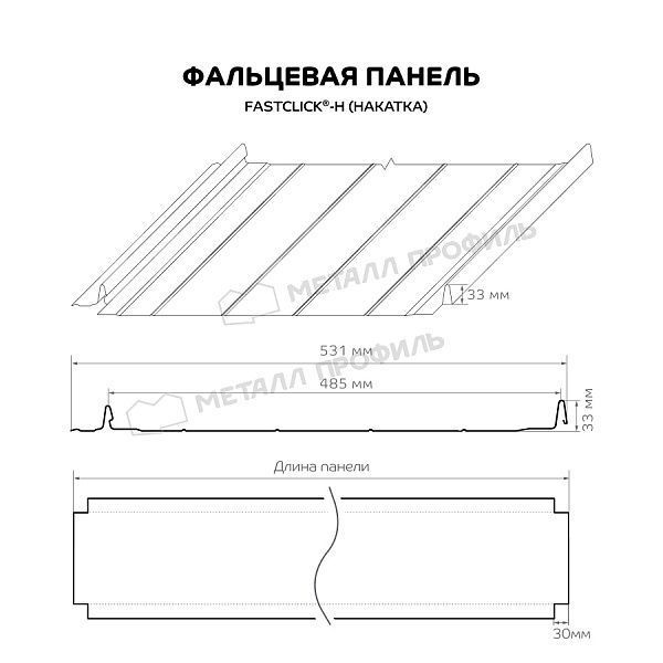 Fastclick® Накатка представляет собой фальцевые панели с узкими продольными рёбрами. Благодаря им материал обладает повышенной жёсткостью, а его установка позволяет минимизировать эффект волнистости, который может возникнуть из-за температурного расширения металла.